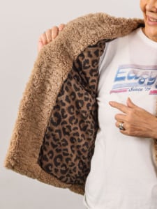 軽くて着やすいボアジレ。裏地がヒョウ柄でアクセントに。