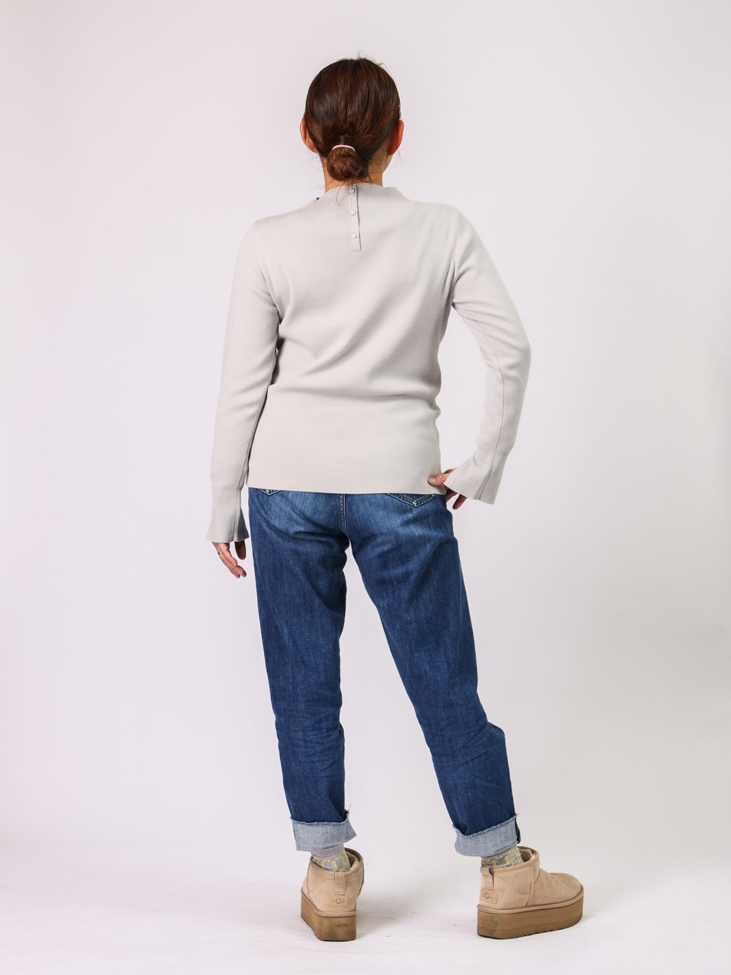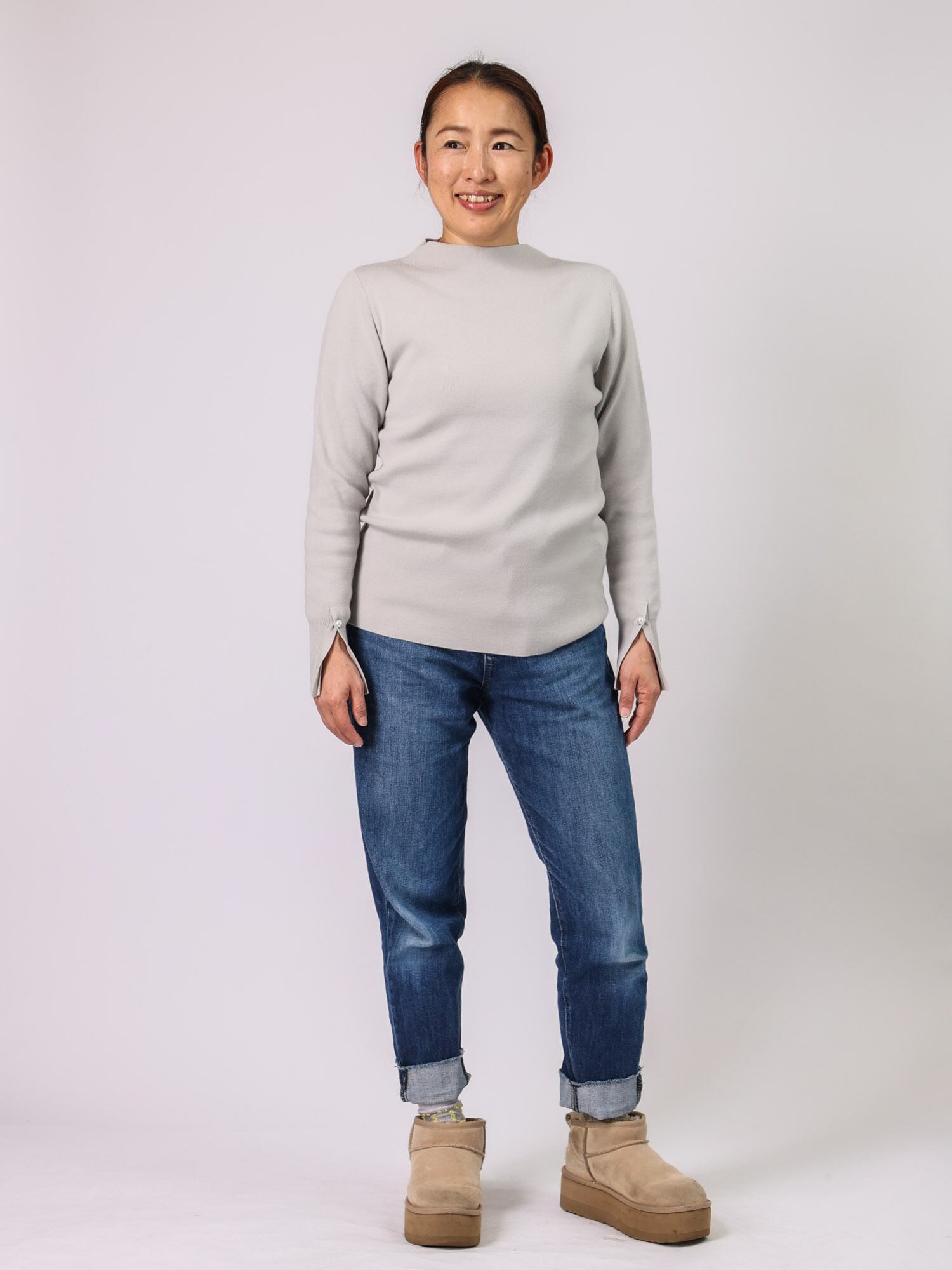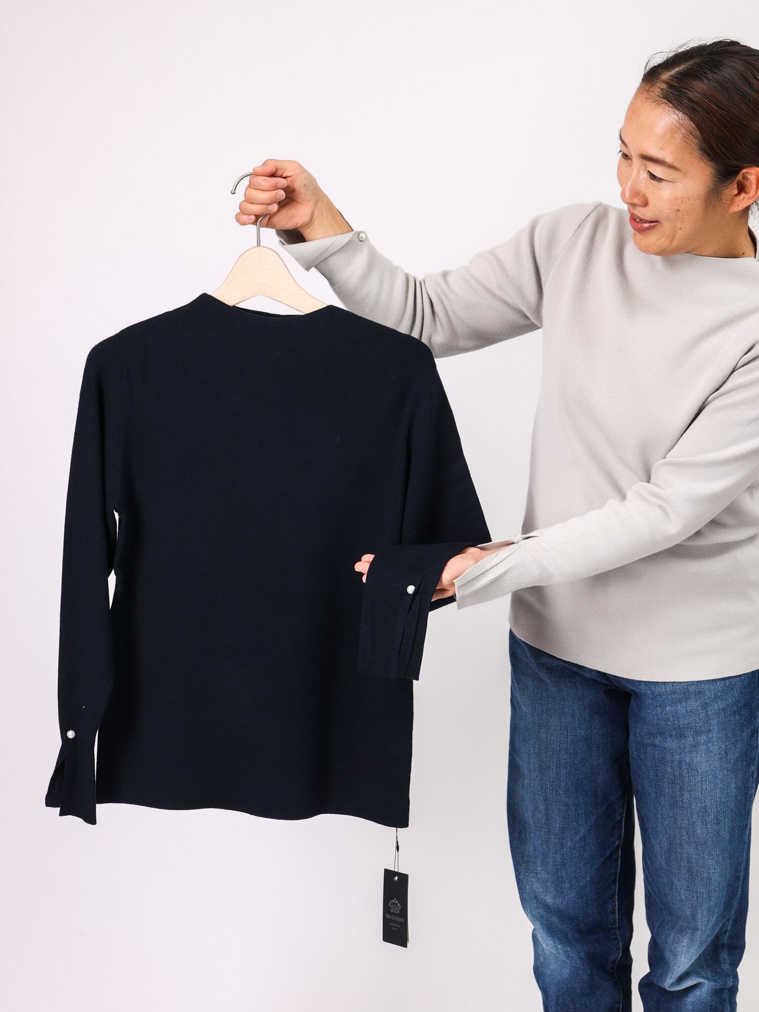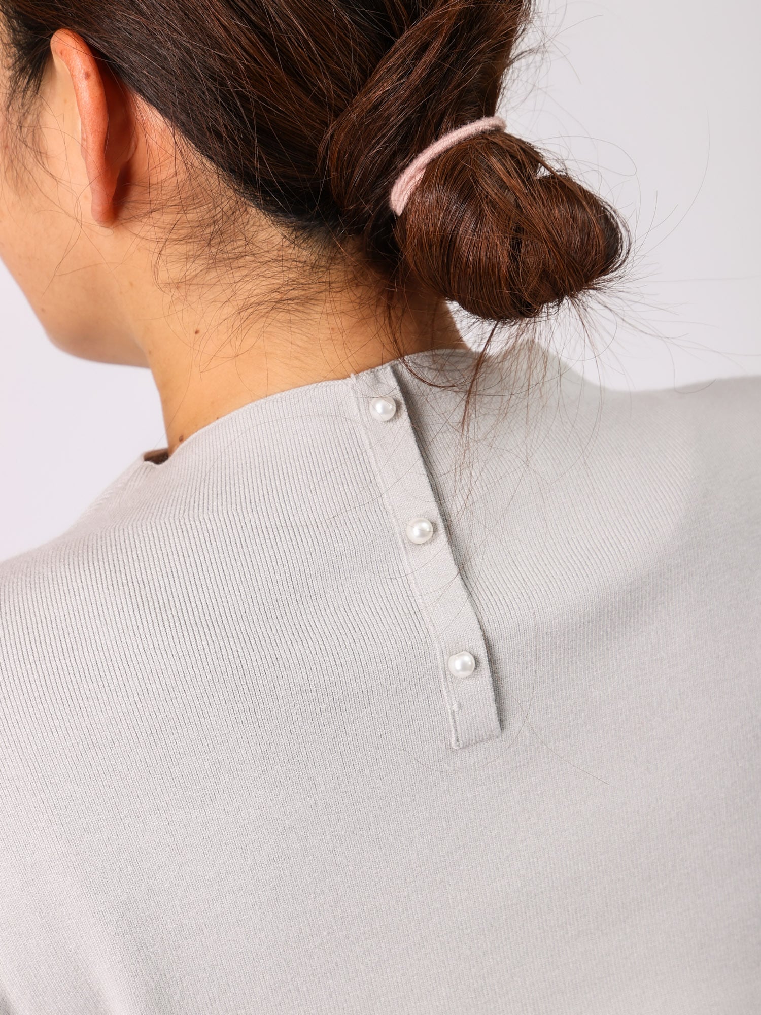 袖口と後ろ衿にあしらったさりげないパールが、品のある華やかさを添える季節問わず活躍する1枚です。