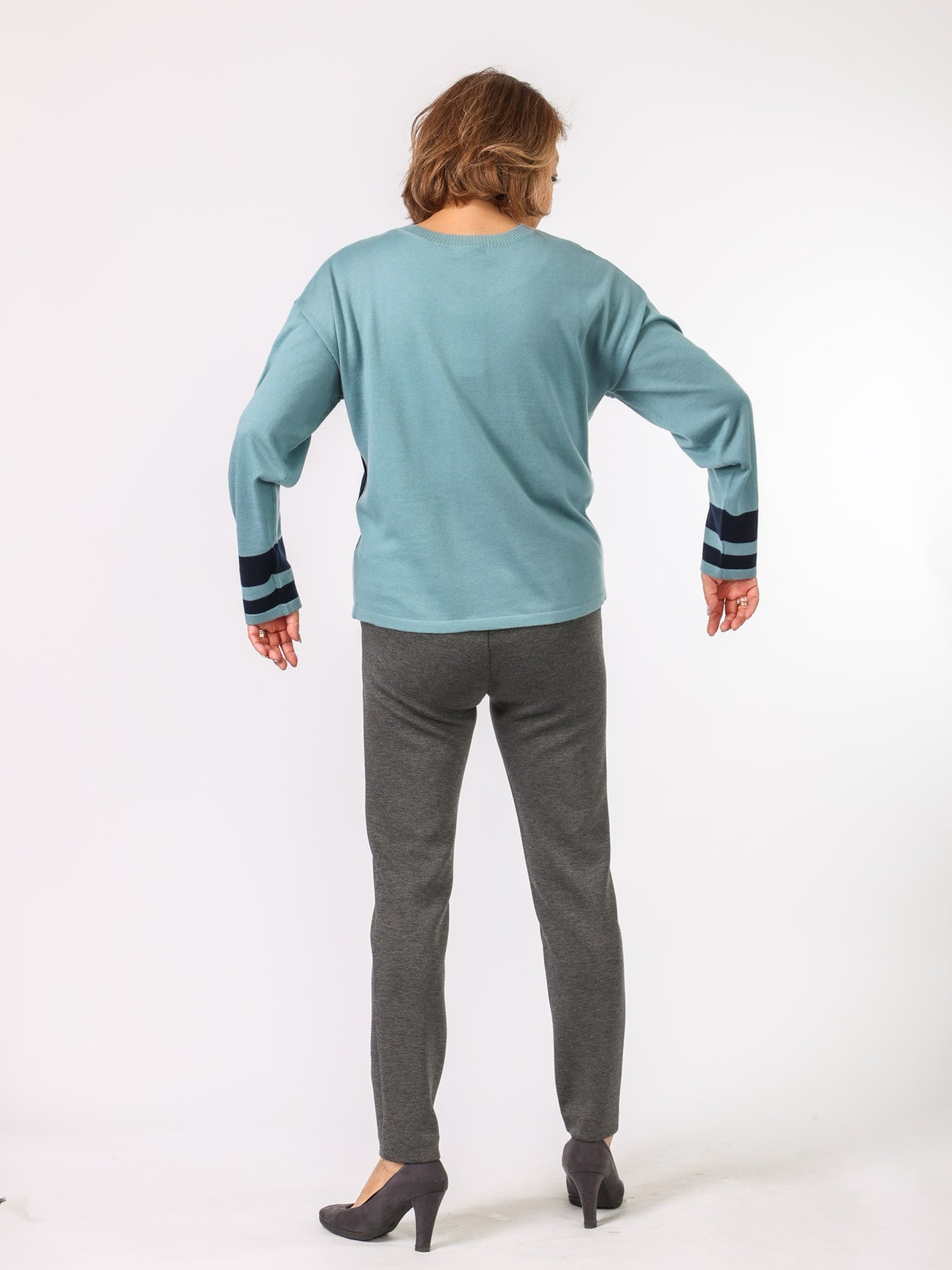 シンプルなクルーネックにシャープな印象のラインがポイントです。