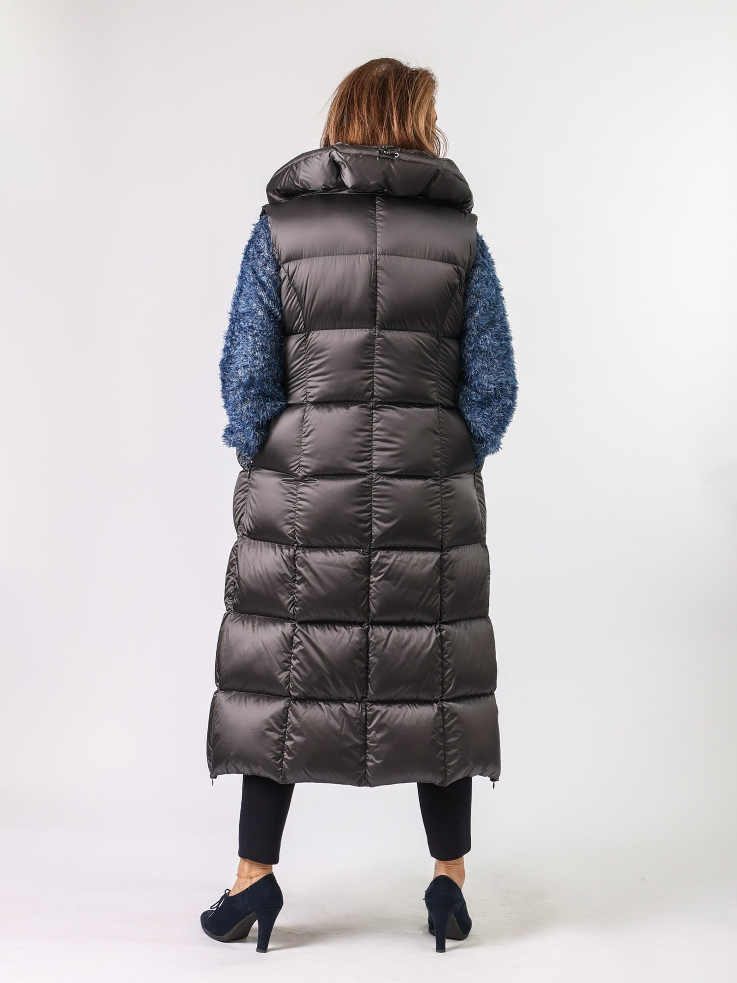 存在感があるボリューム衿が印象的なダウンロングベスト。