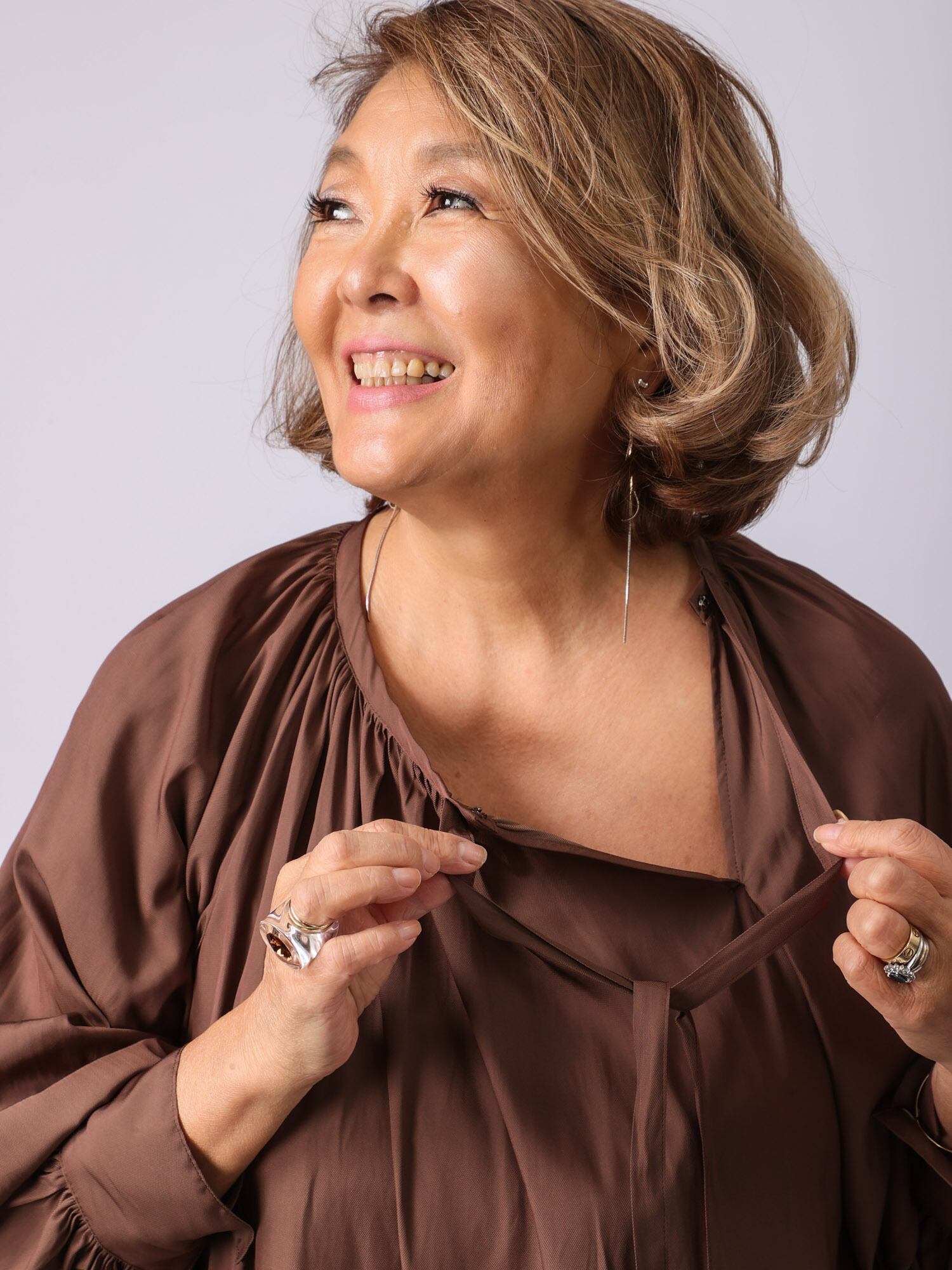 アセテートのような光沢感と、ソフトで柔らかな風合いがあり、シワが目立ちにくい素材。