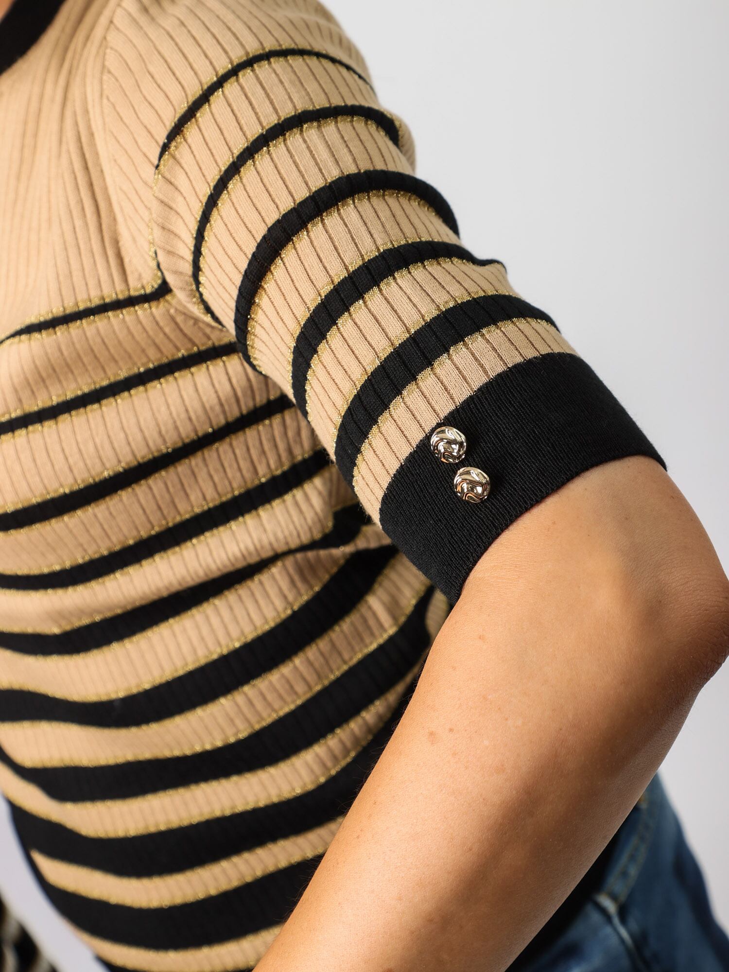 ラメ糸をアクセントに構成したボーダーが美しい、18Gのしなやかなリブニット。