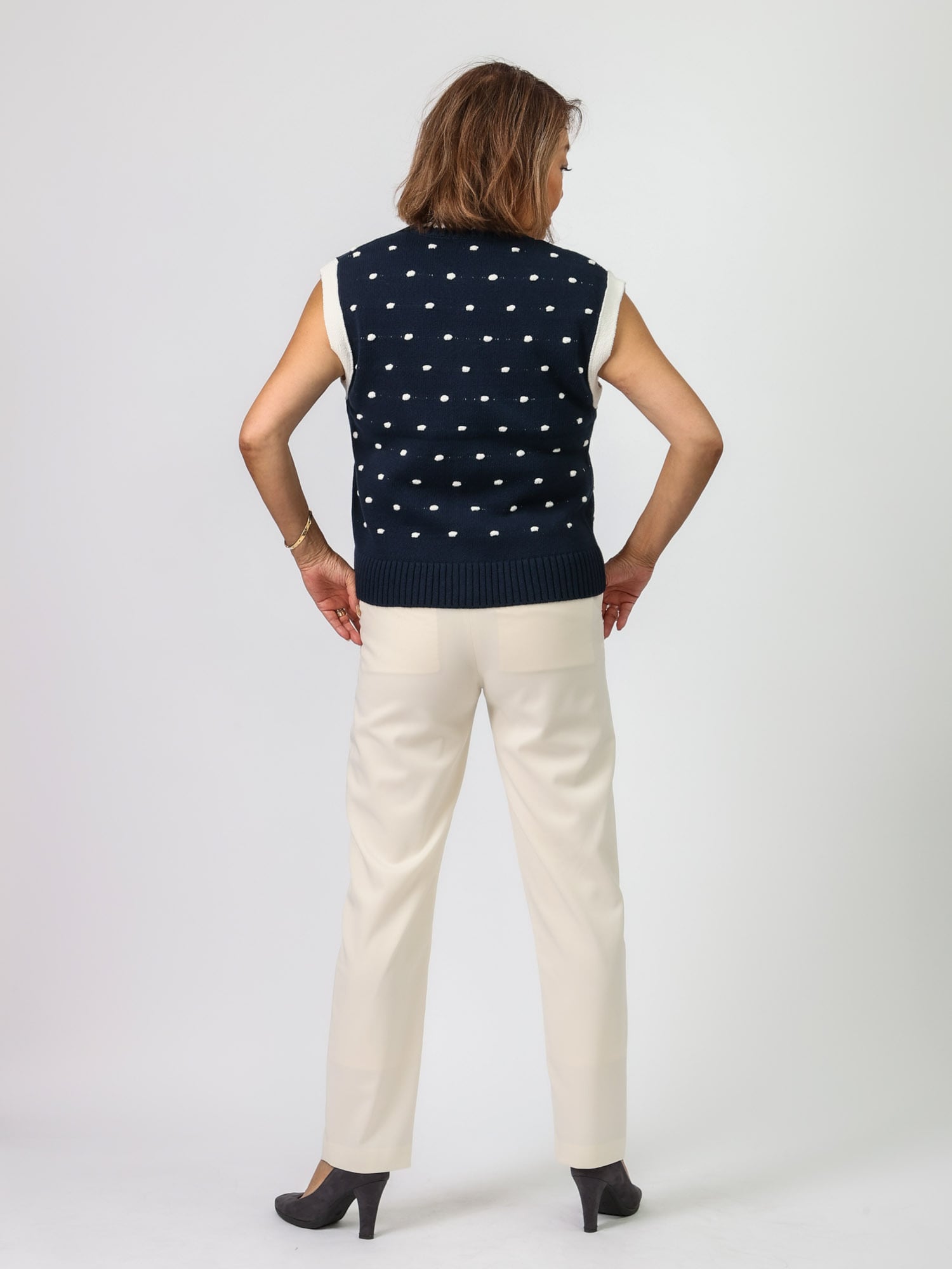 定番の前スリットパンツのスリットの位置をやや外側に変更し、