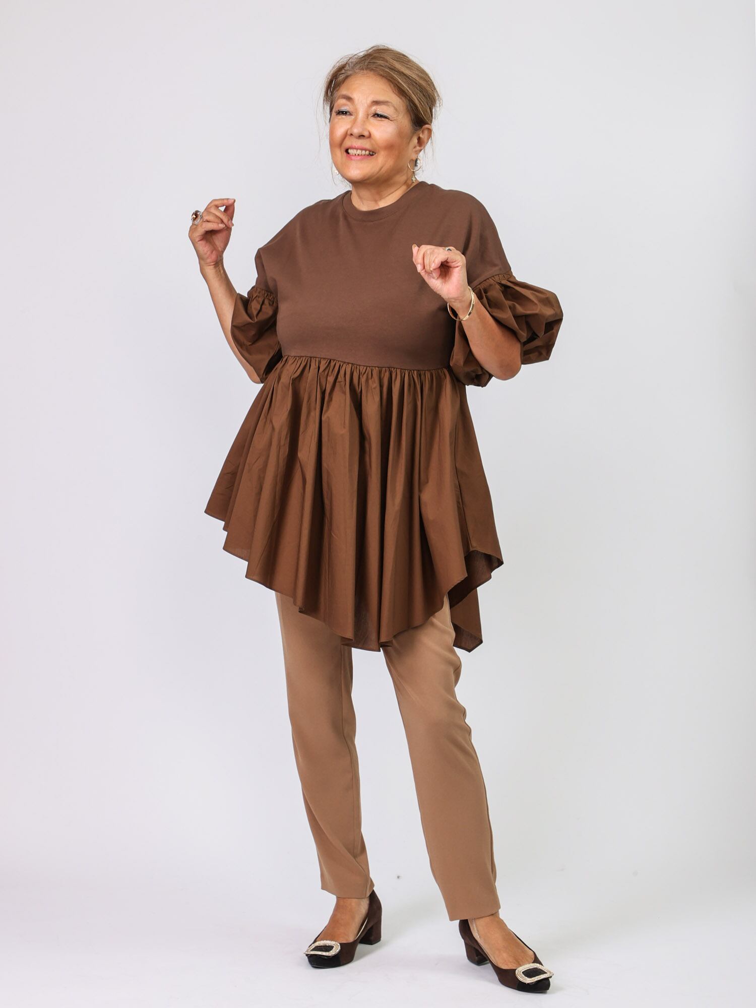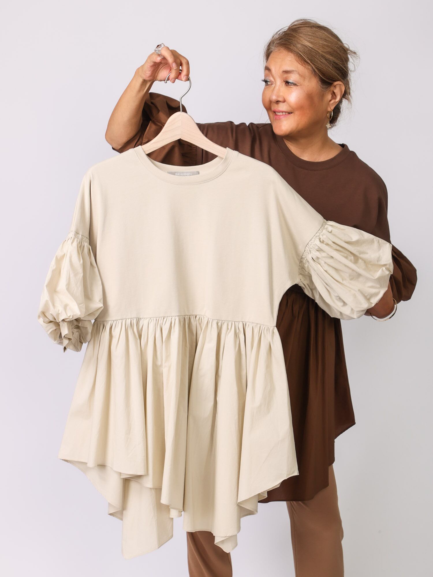 袖と切り替え部分には軽やかな綿ブロードを使用し、ギャザーを寄せてボリューム感を出しています。