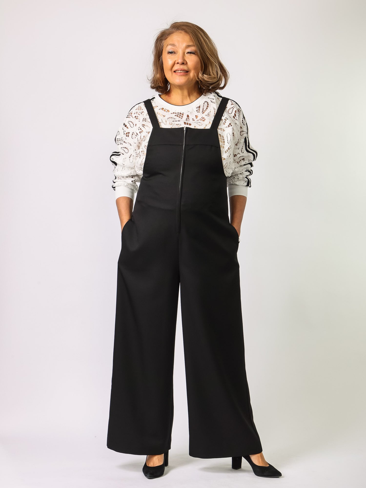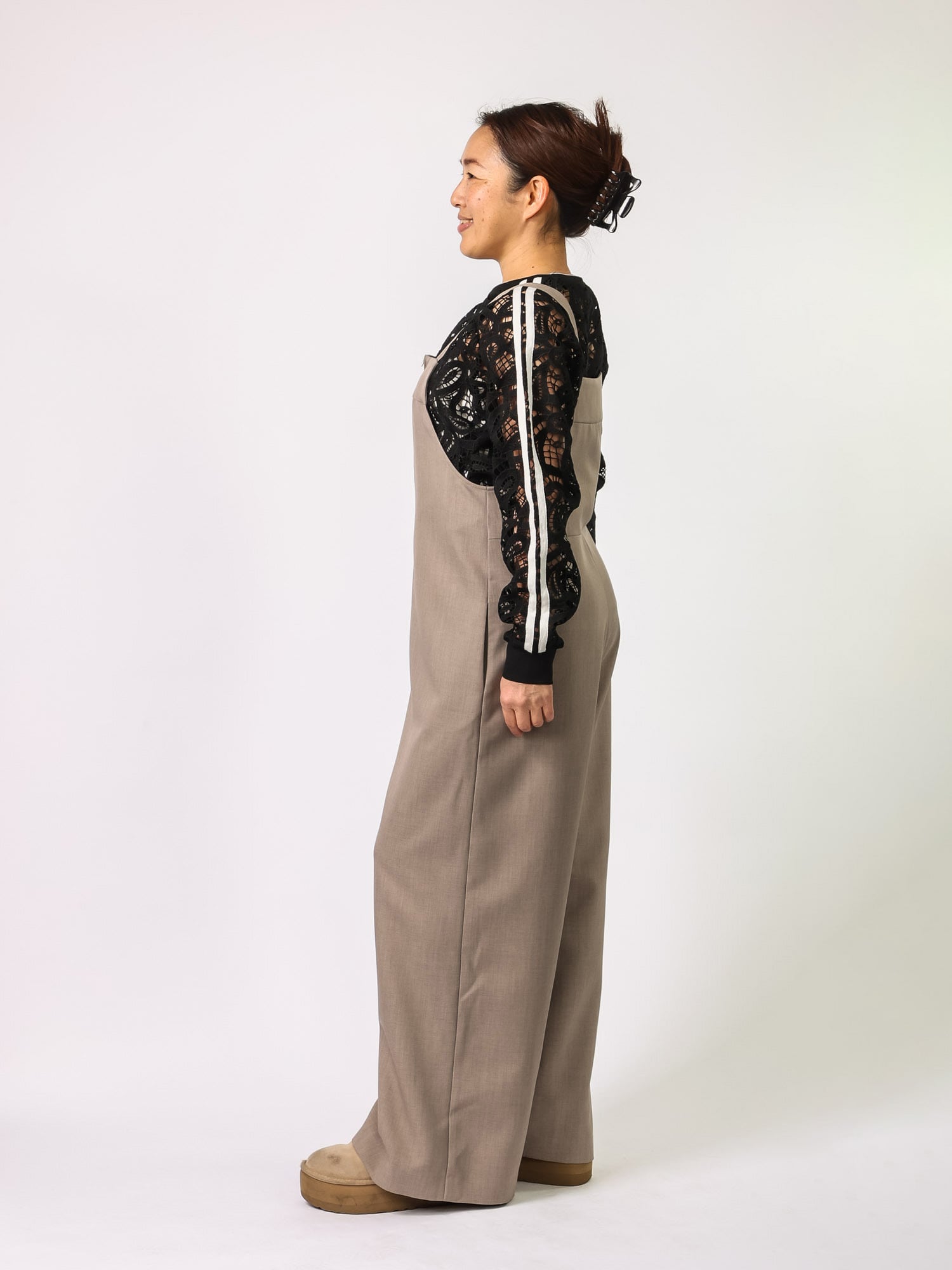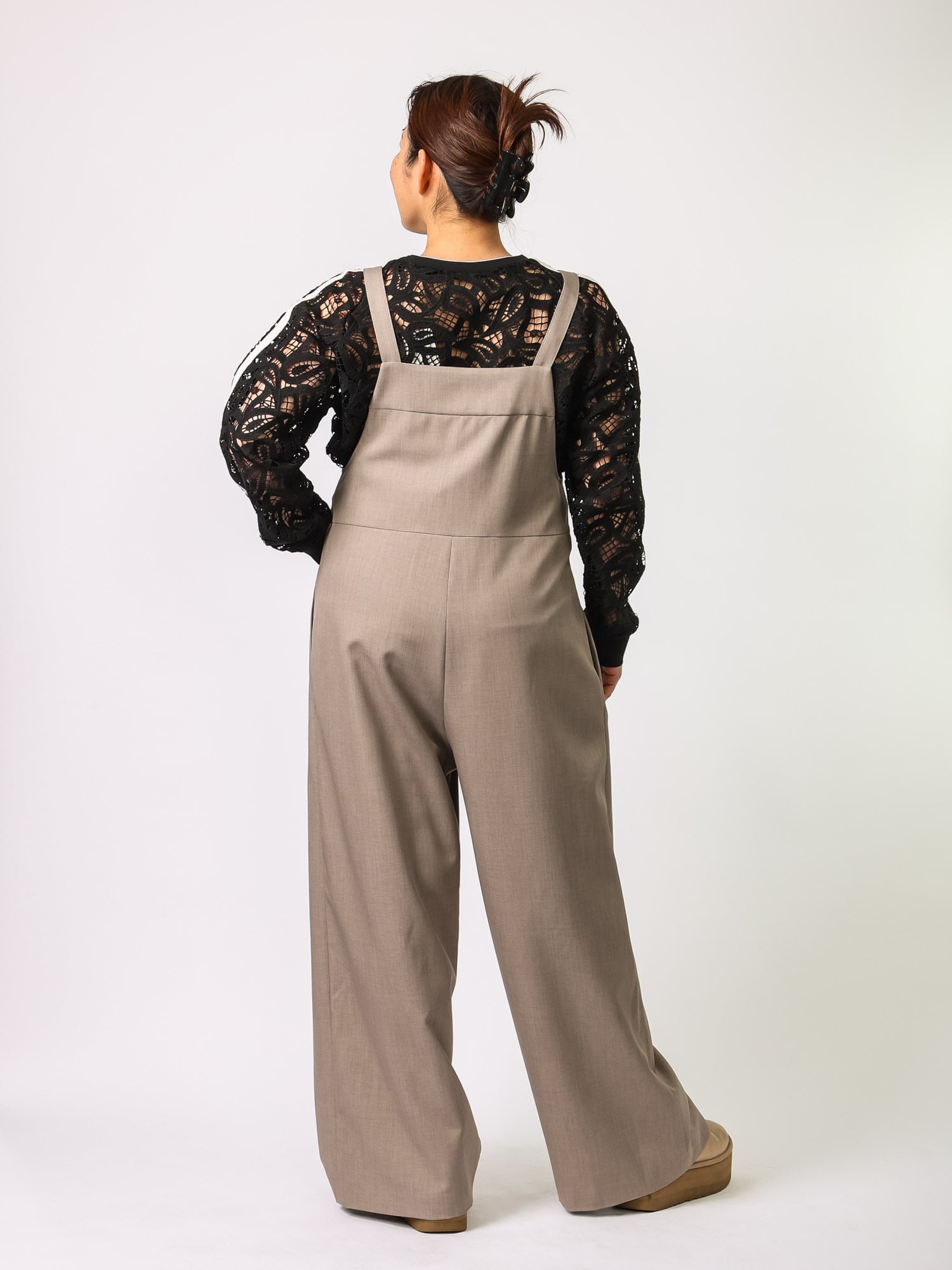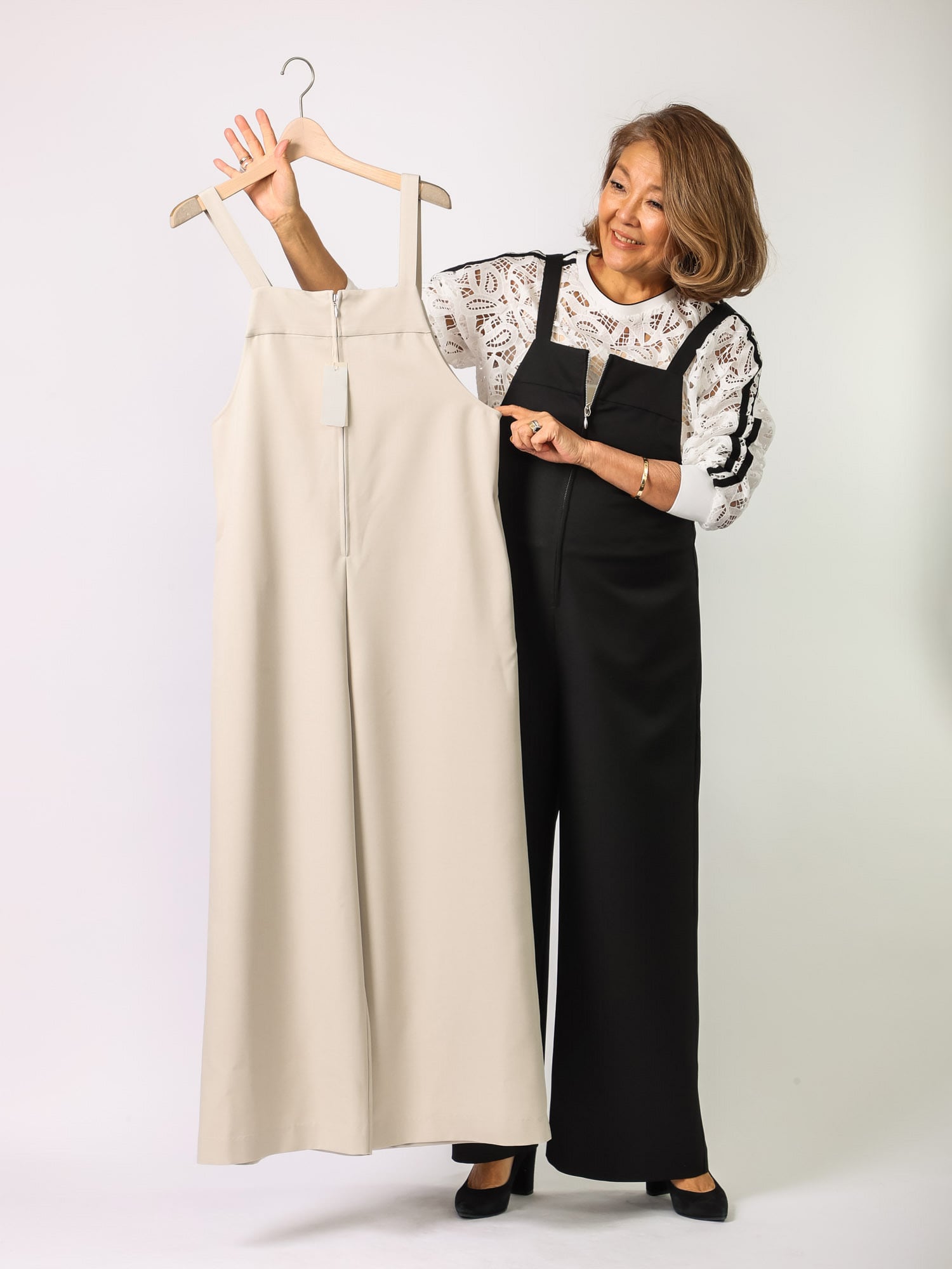 フロントジップで着脱しやすくすっきり仕上げたサロペット。