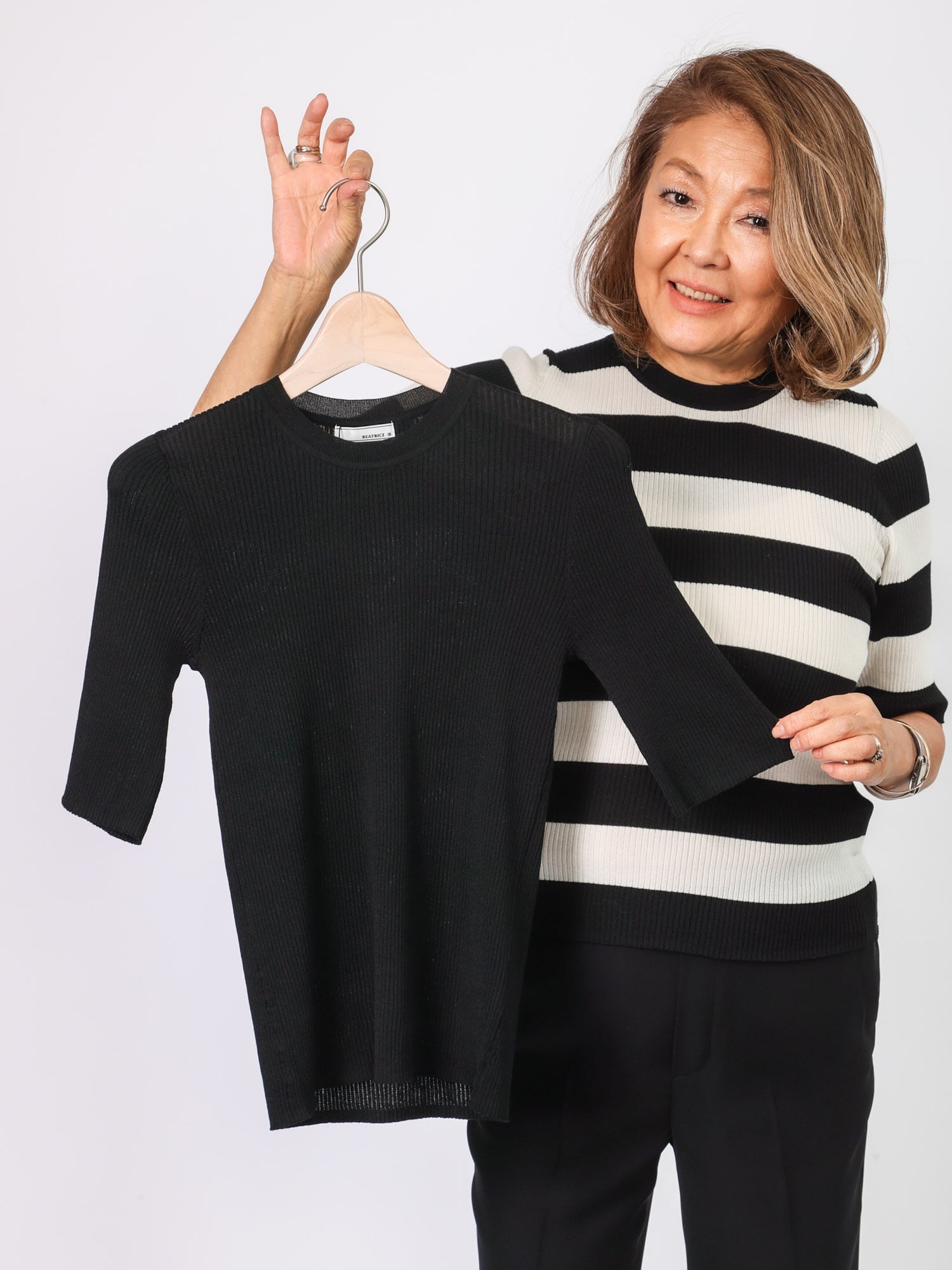 五分袖のシンプルなリブニットは、どんなスタイリングにも合う一枚です。