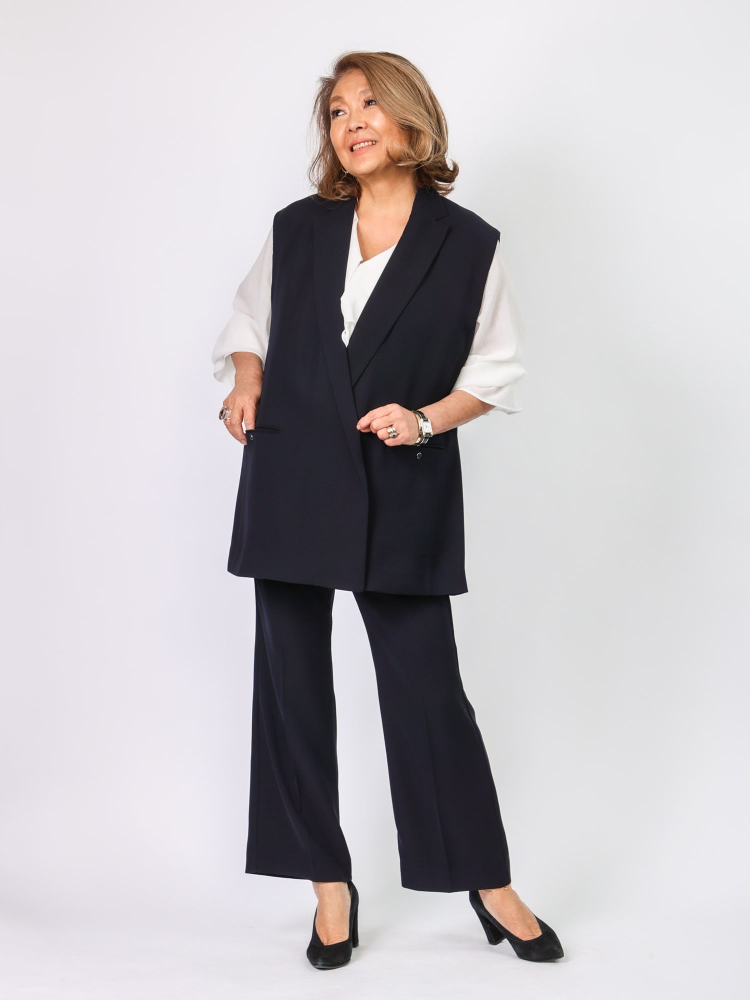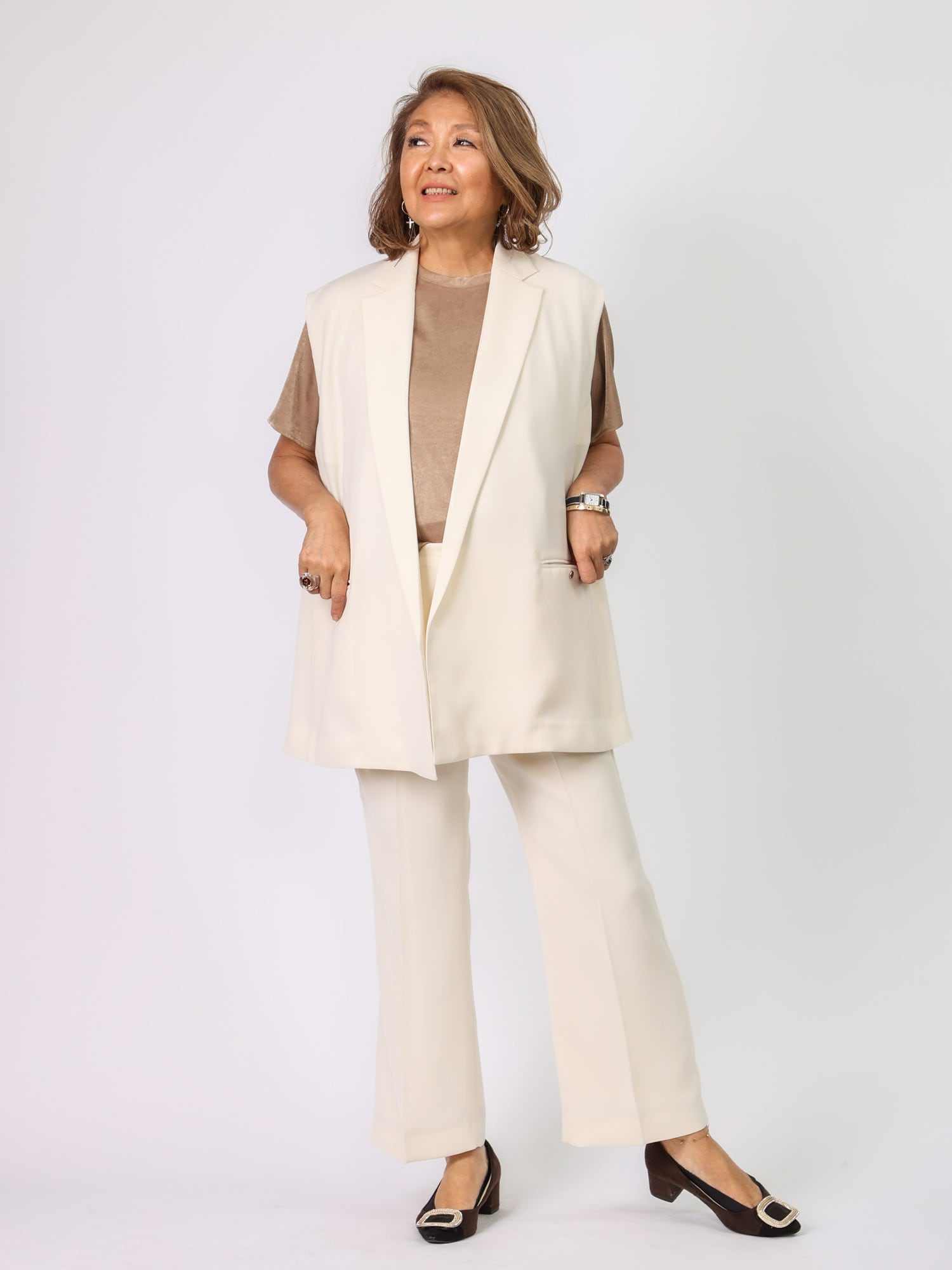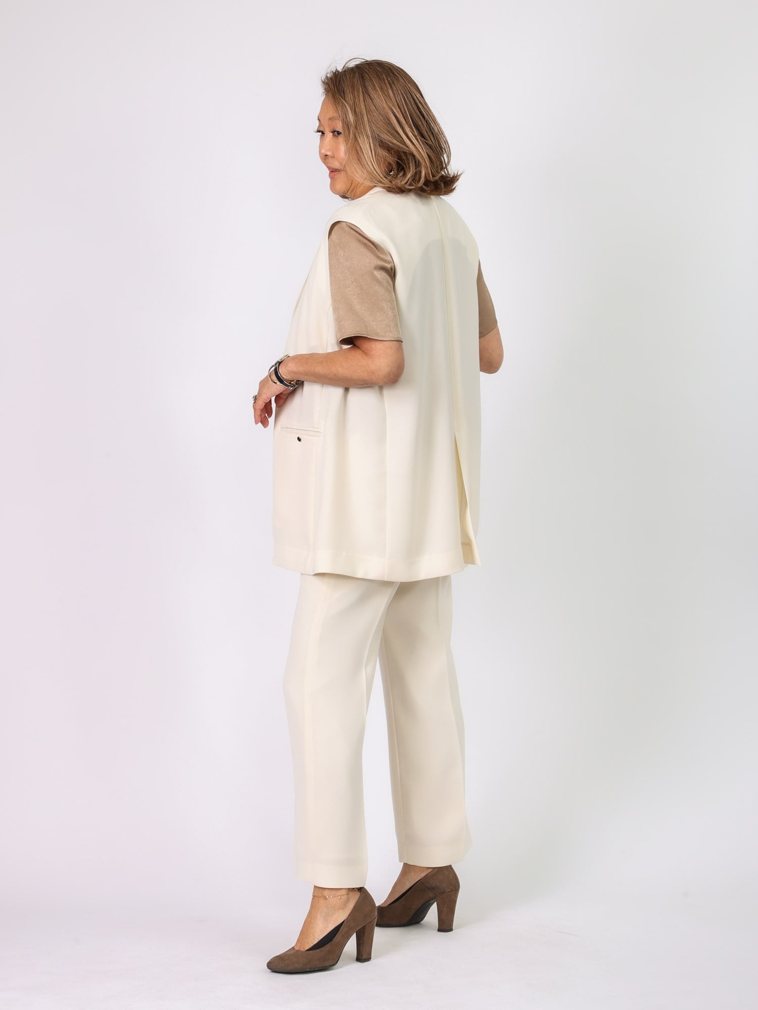 同素材のジレB42102とセットアップ風に着こなすのもおすすめです。