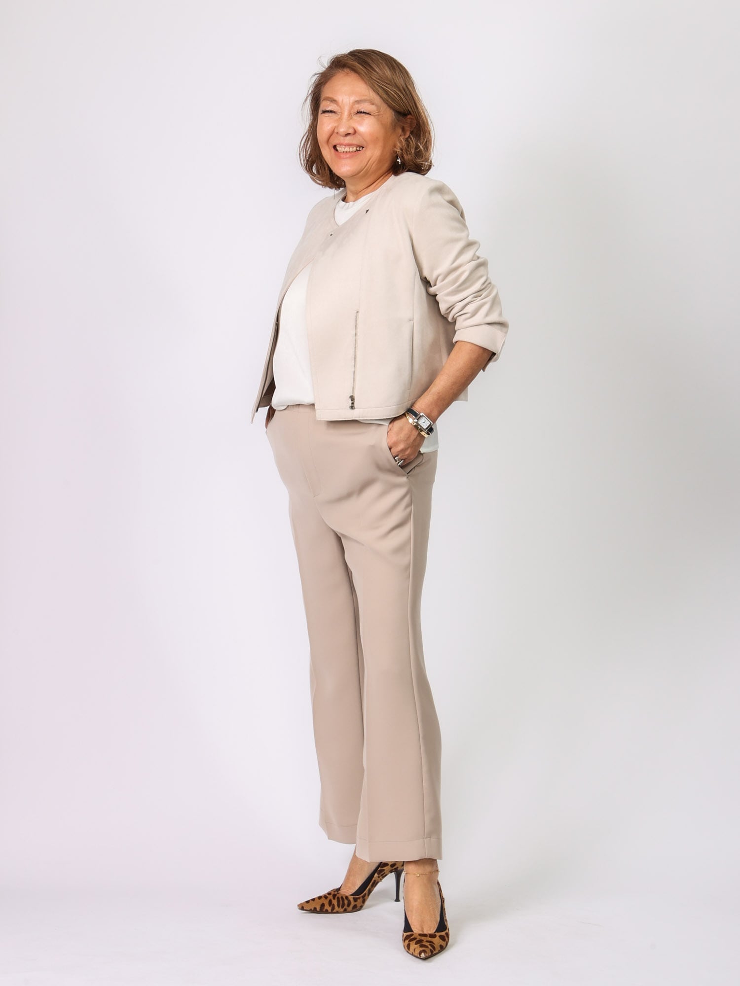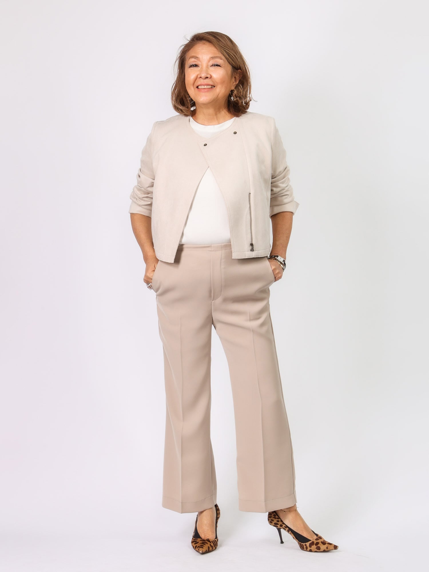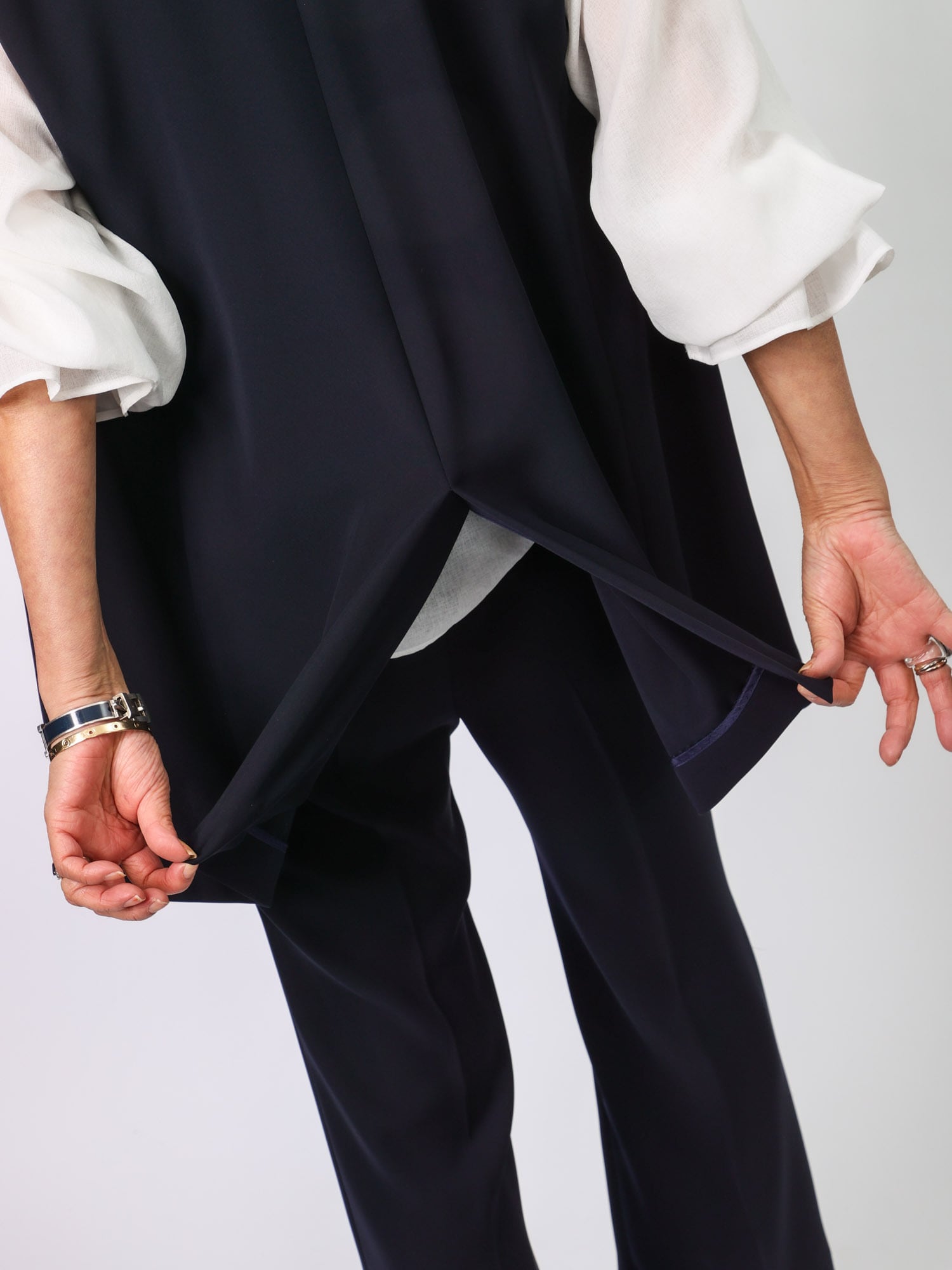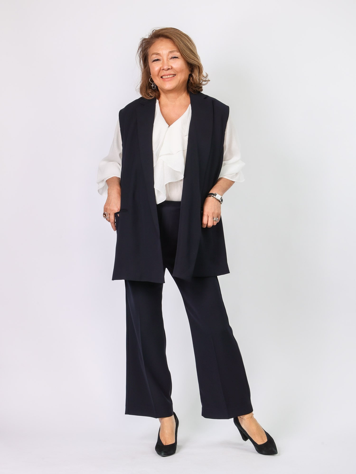 同素材のジレB42102とセットアップ風に着こなすのもおすすめです。
