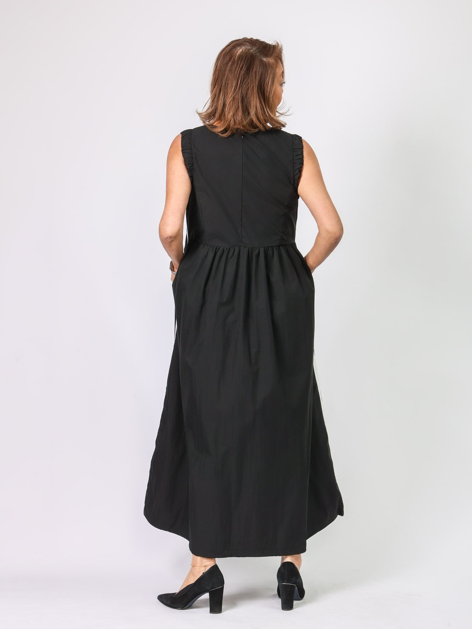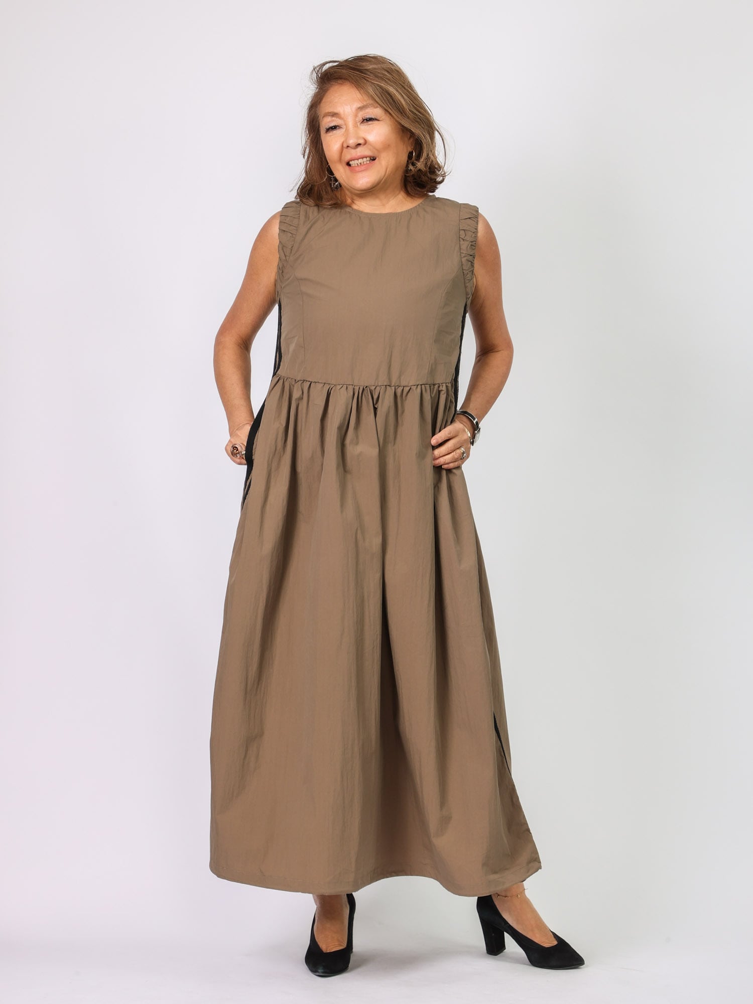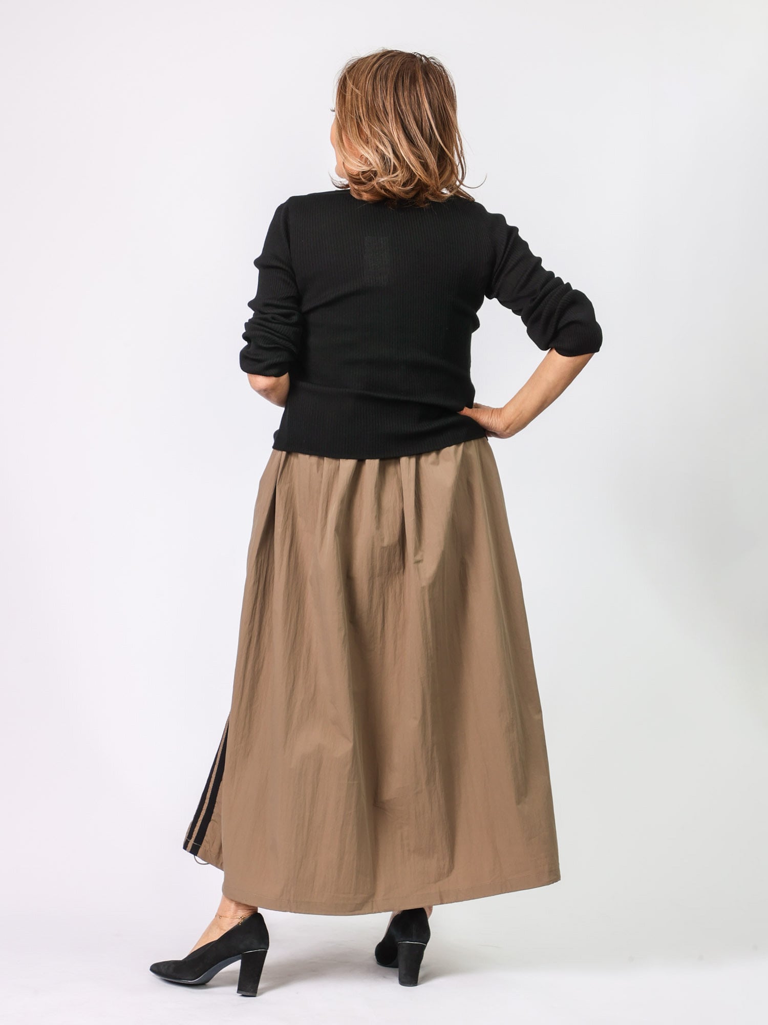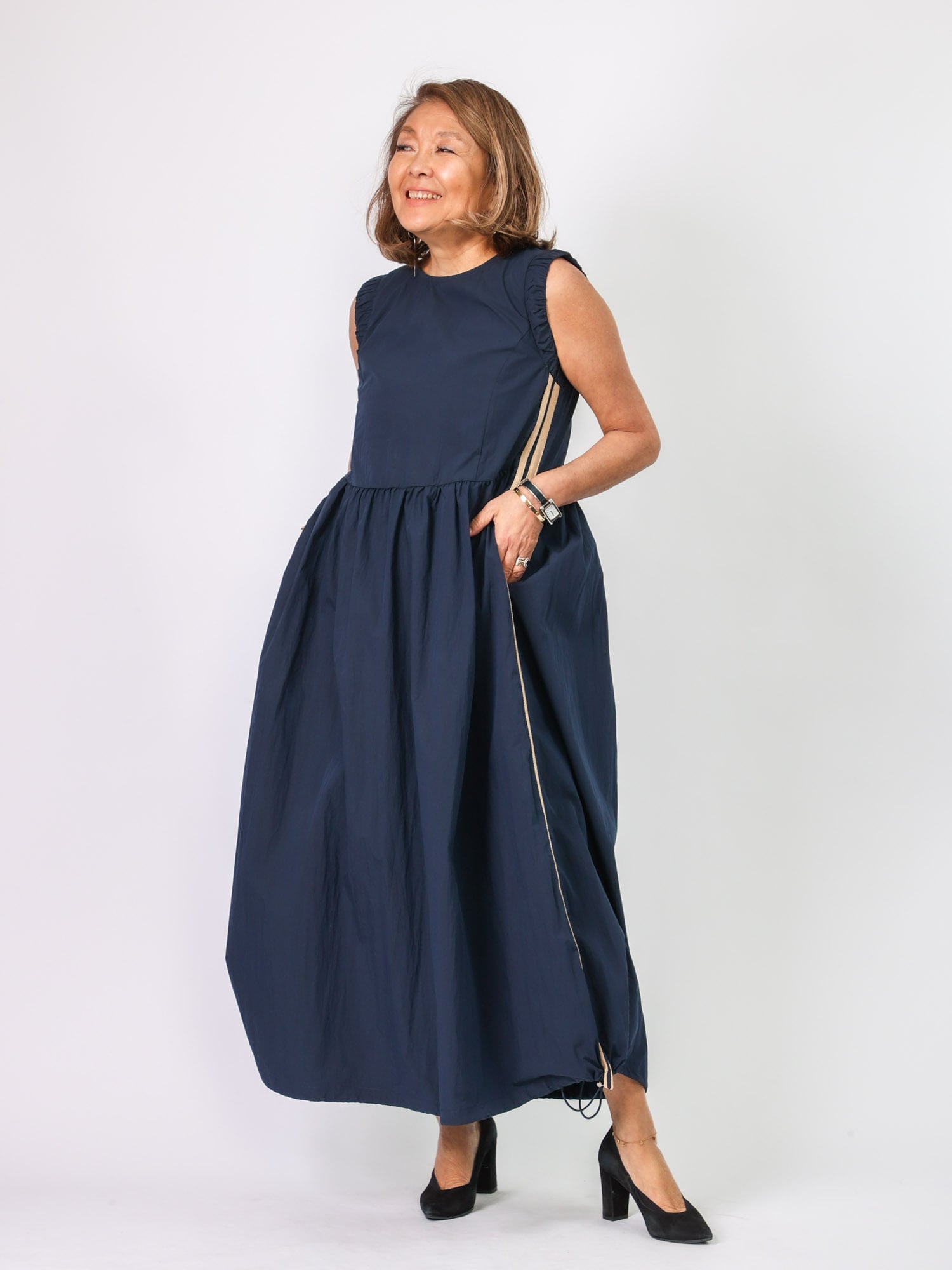 裾にコードが入っており、シルエットを変化させることが可能。
