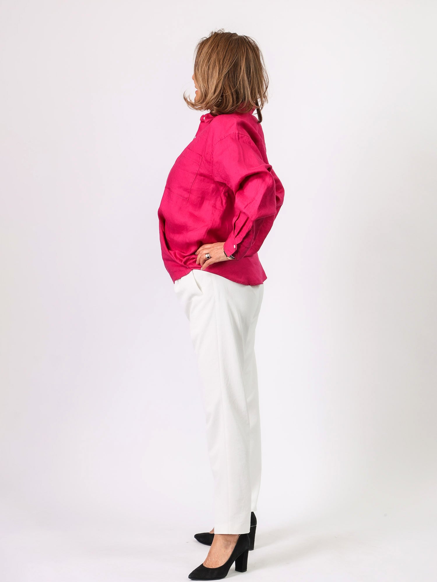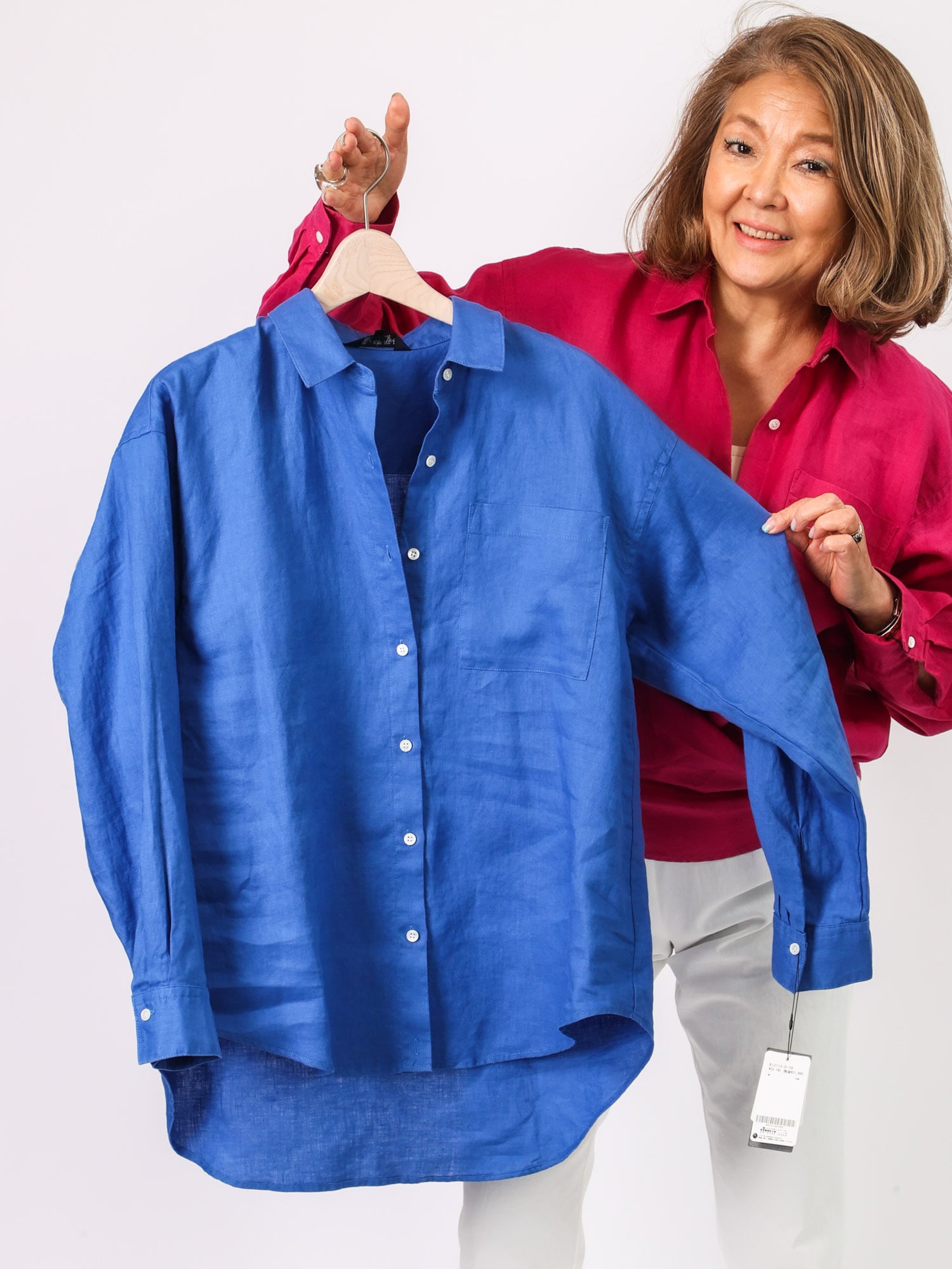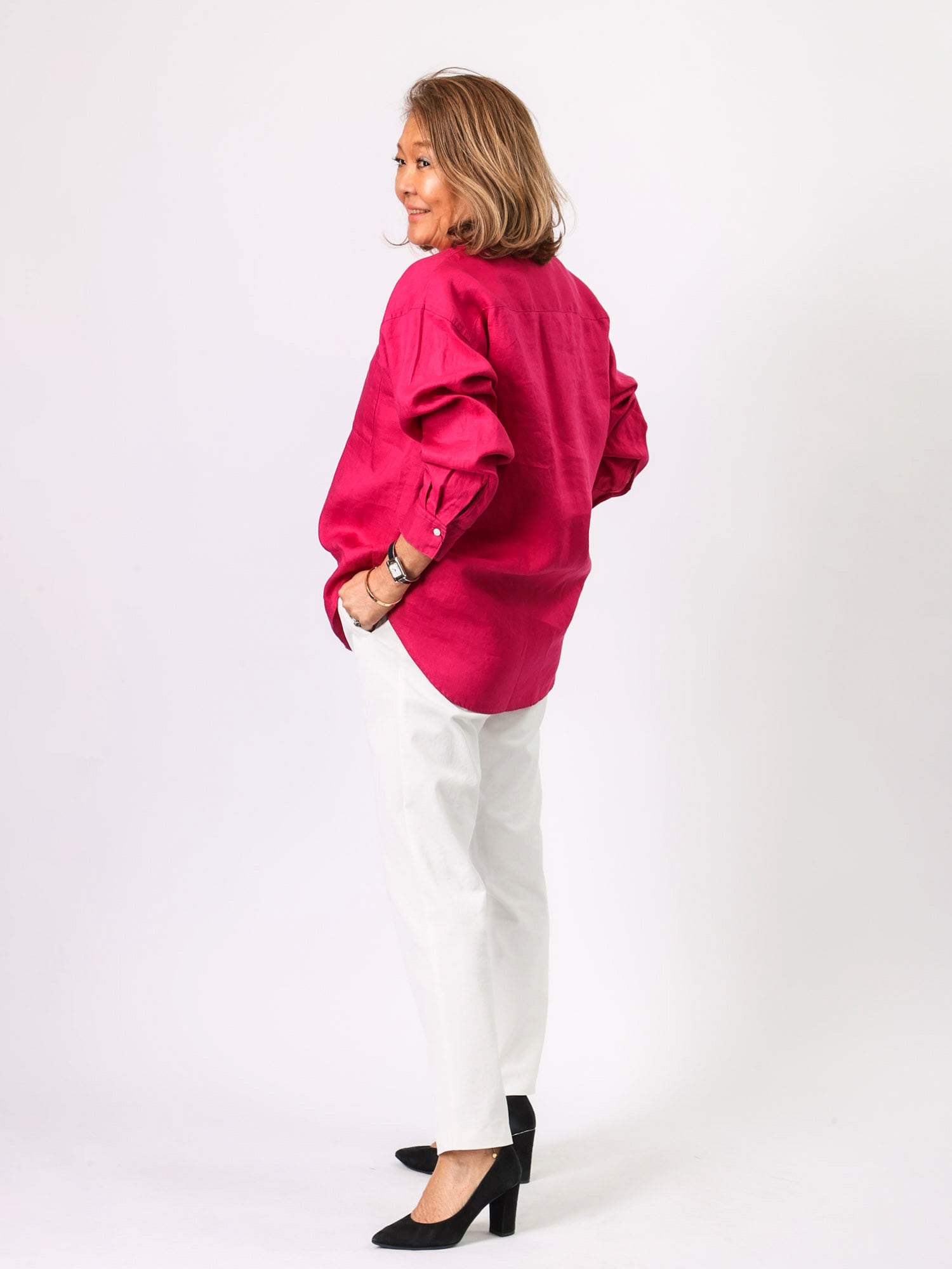 通気性がよく、リネン素材ならではの軽やかな着心地を楽しめるシャツブラウス。