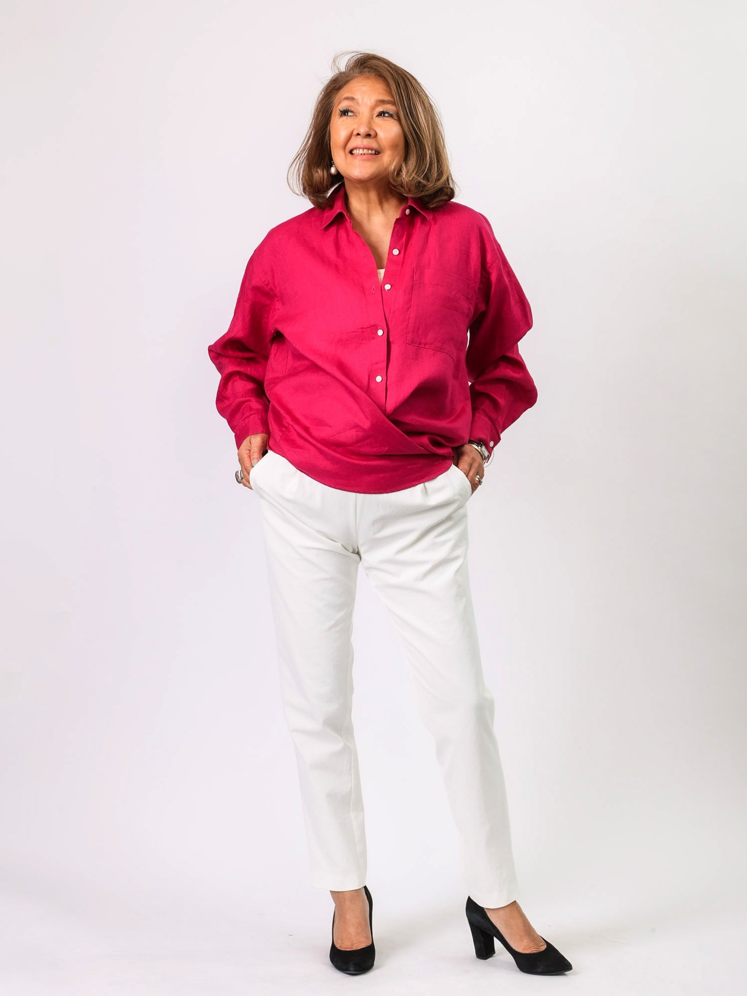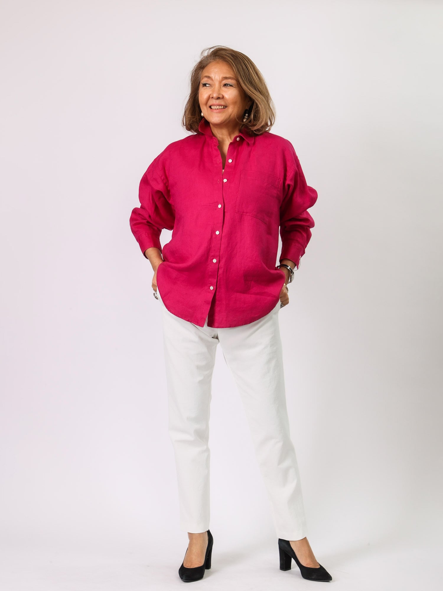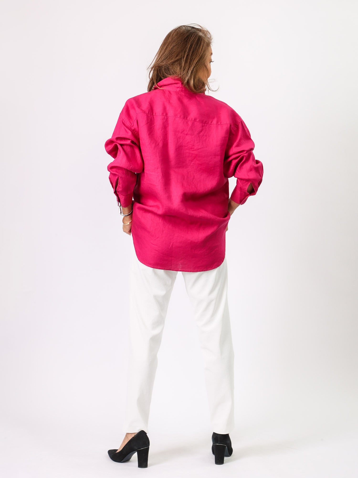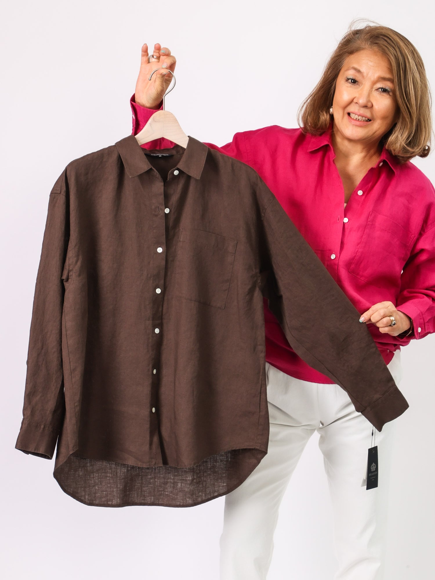 通気性がよく、リネン素材ならではの軽やかな着心地を楽しめるシャツブラウス。
