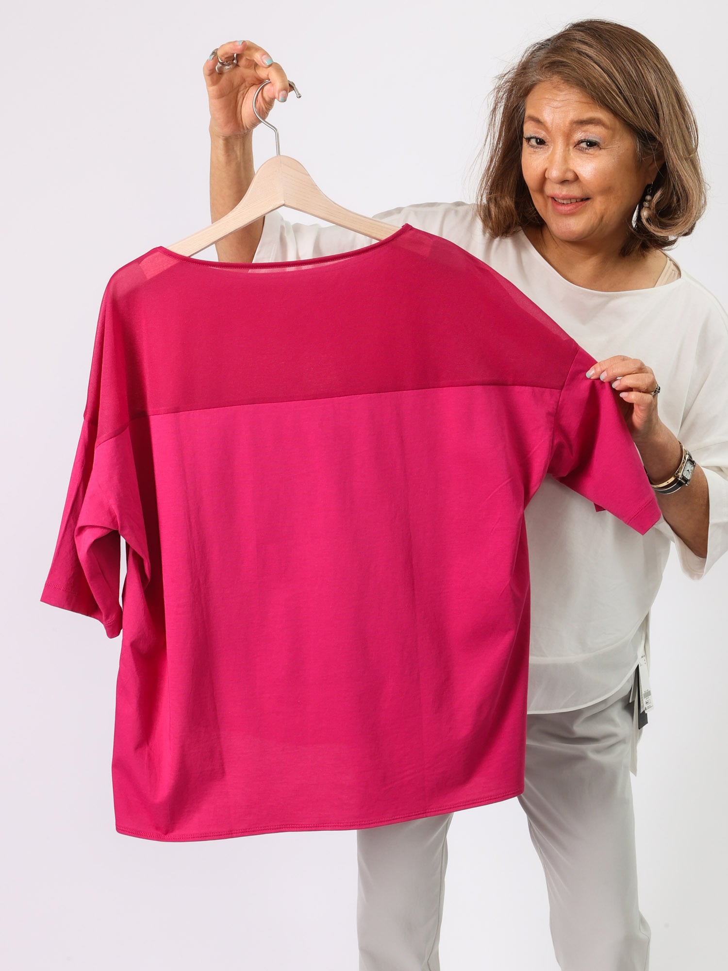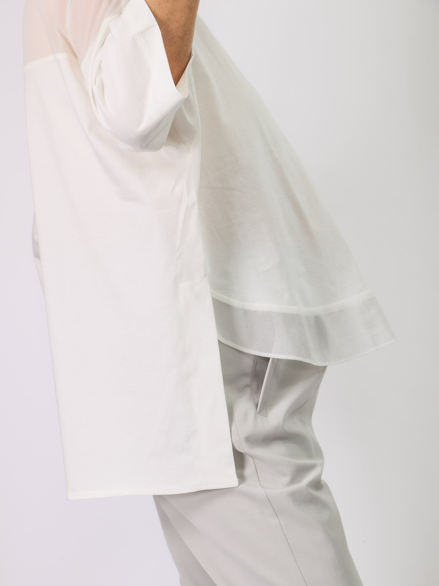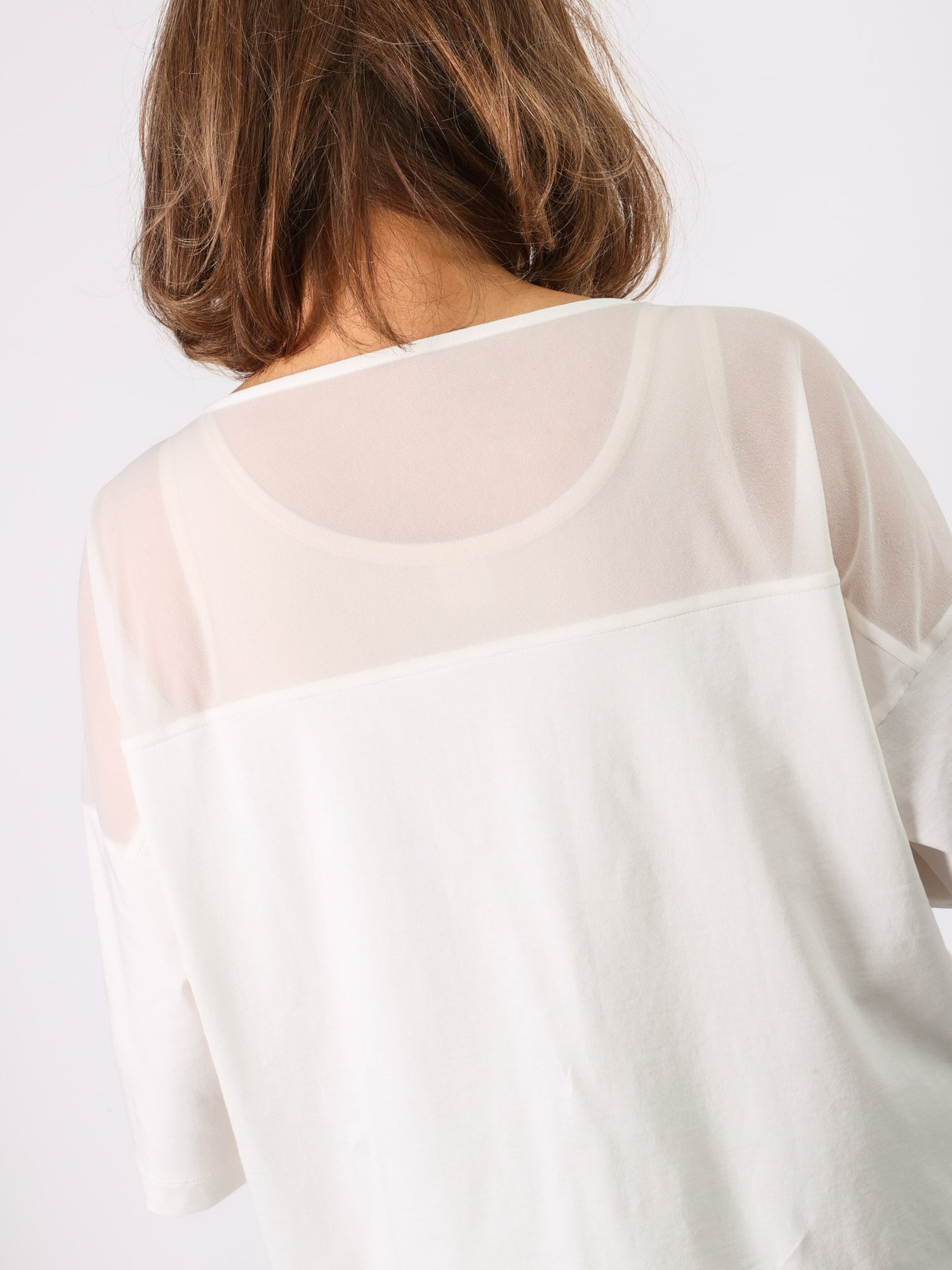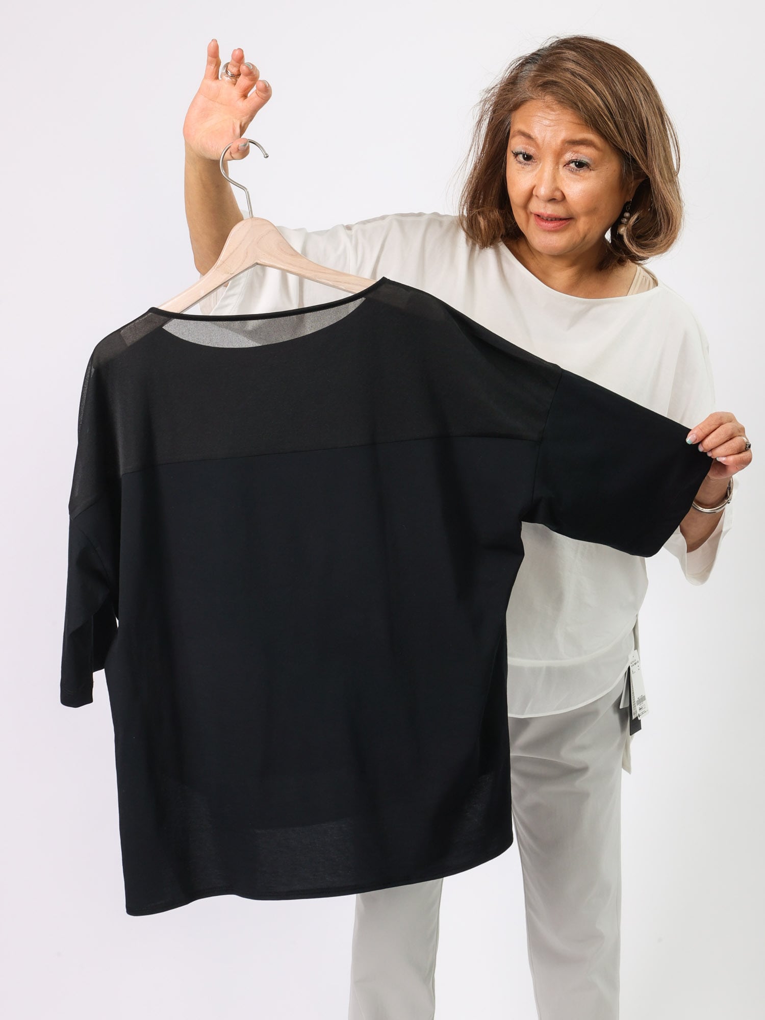 ビッグシルエットながら、背中ヨークと前裾の透け切り替えで軽やかさと遊び心をプラスしました。袖の長さと広がりが1枚でもエレガントに着られます。