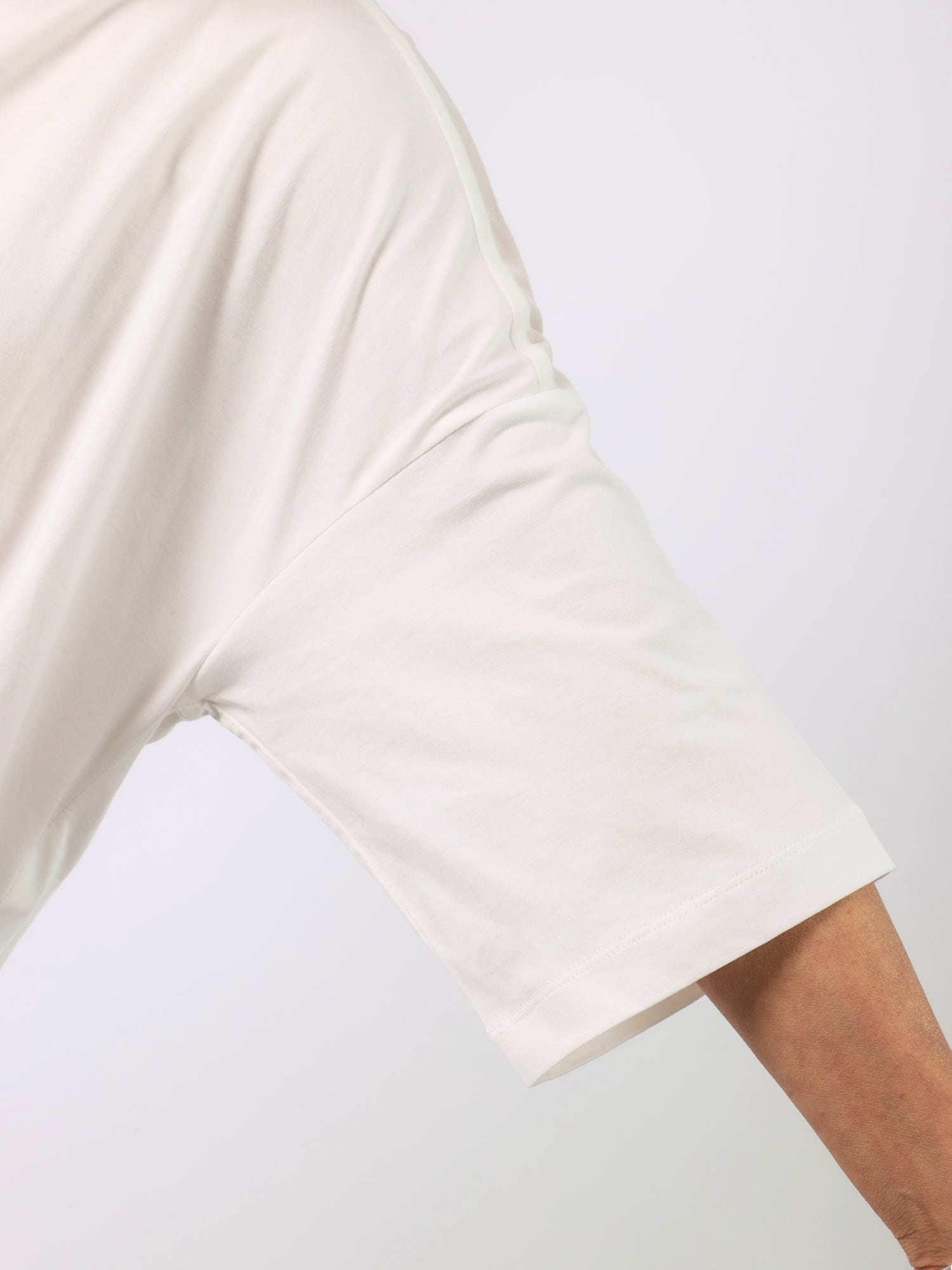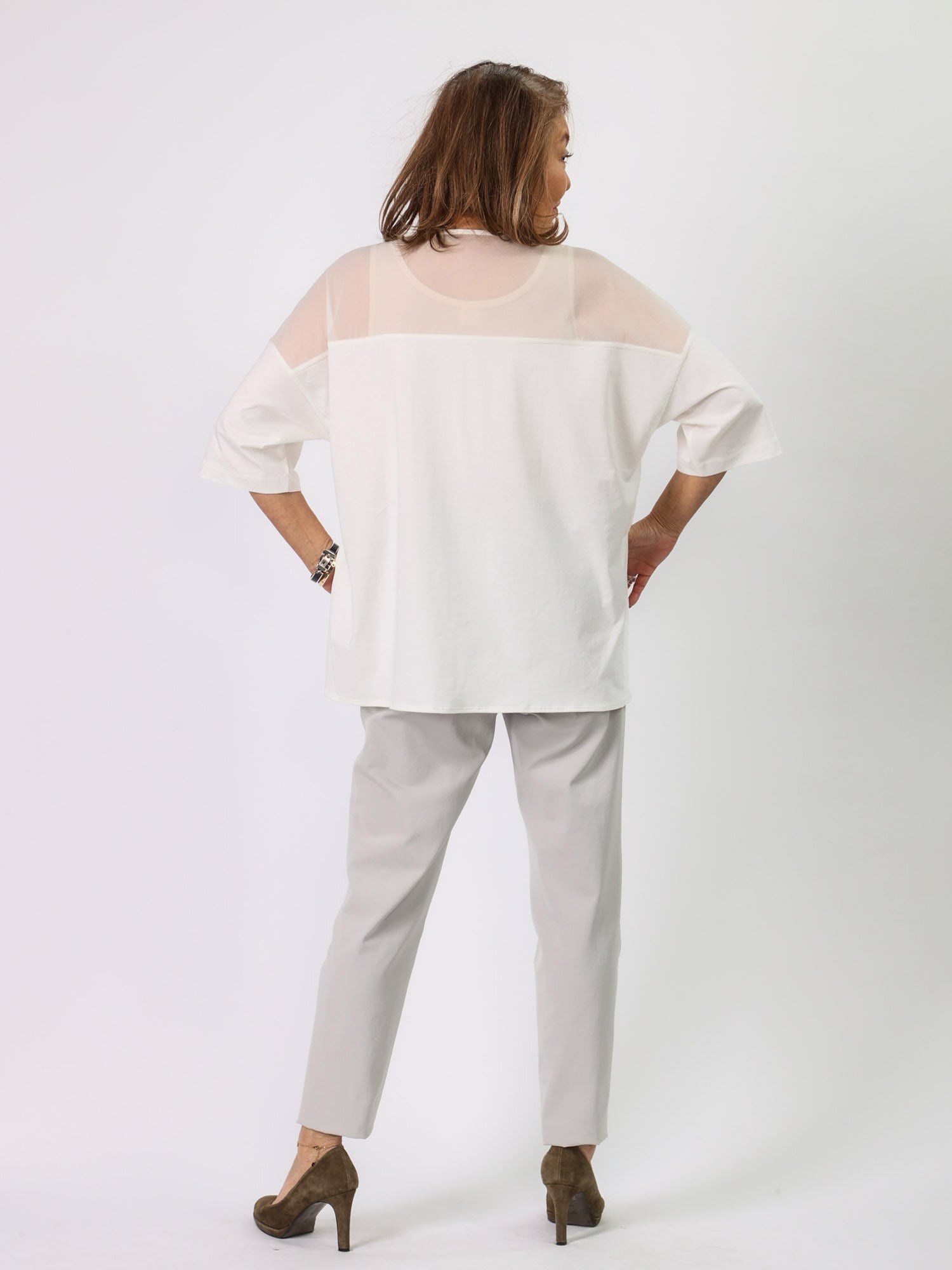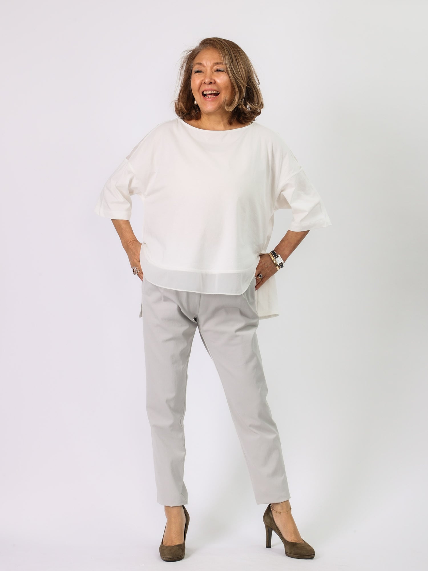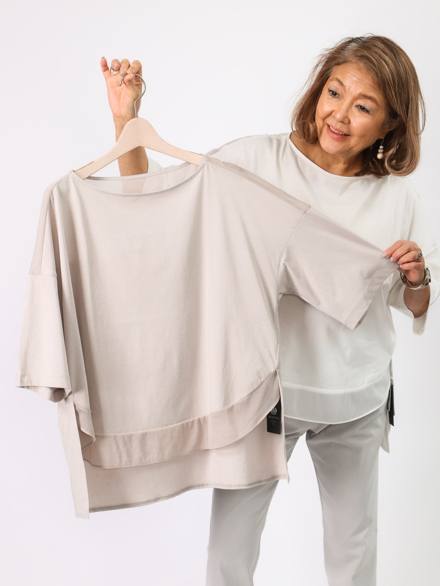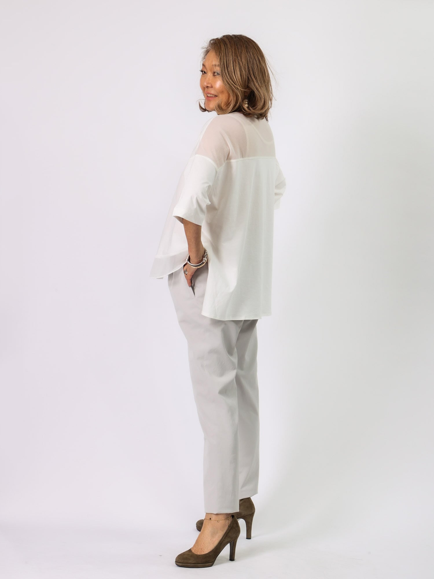 ビッグシルエットながら、背中ヨークと前裾の透け切り替えで軽やかさと遊び心をプラスしました。袖の長さと広がりが1枚でもエレガントに着られます。