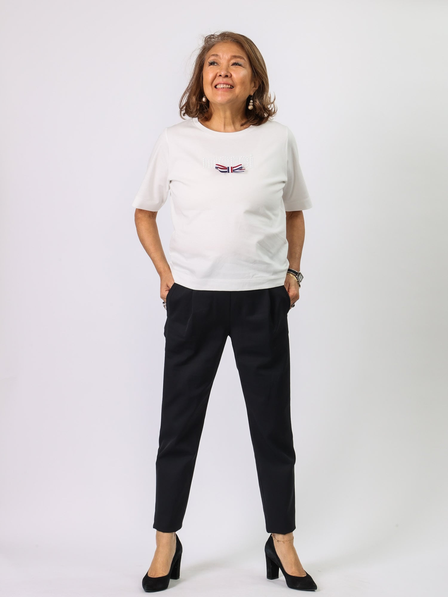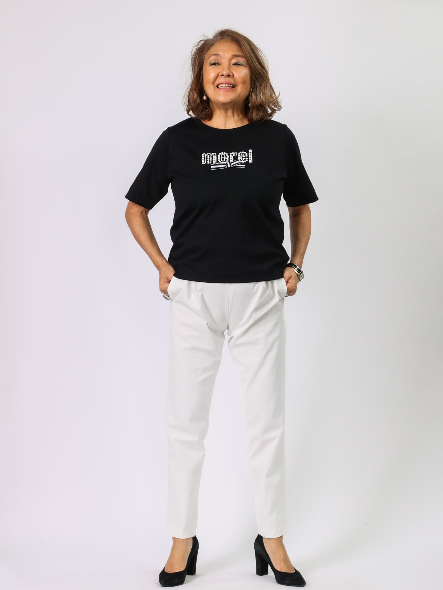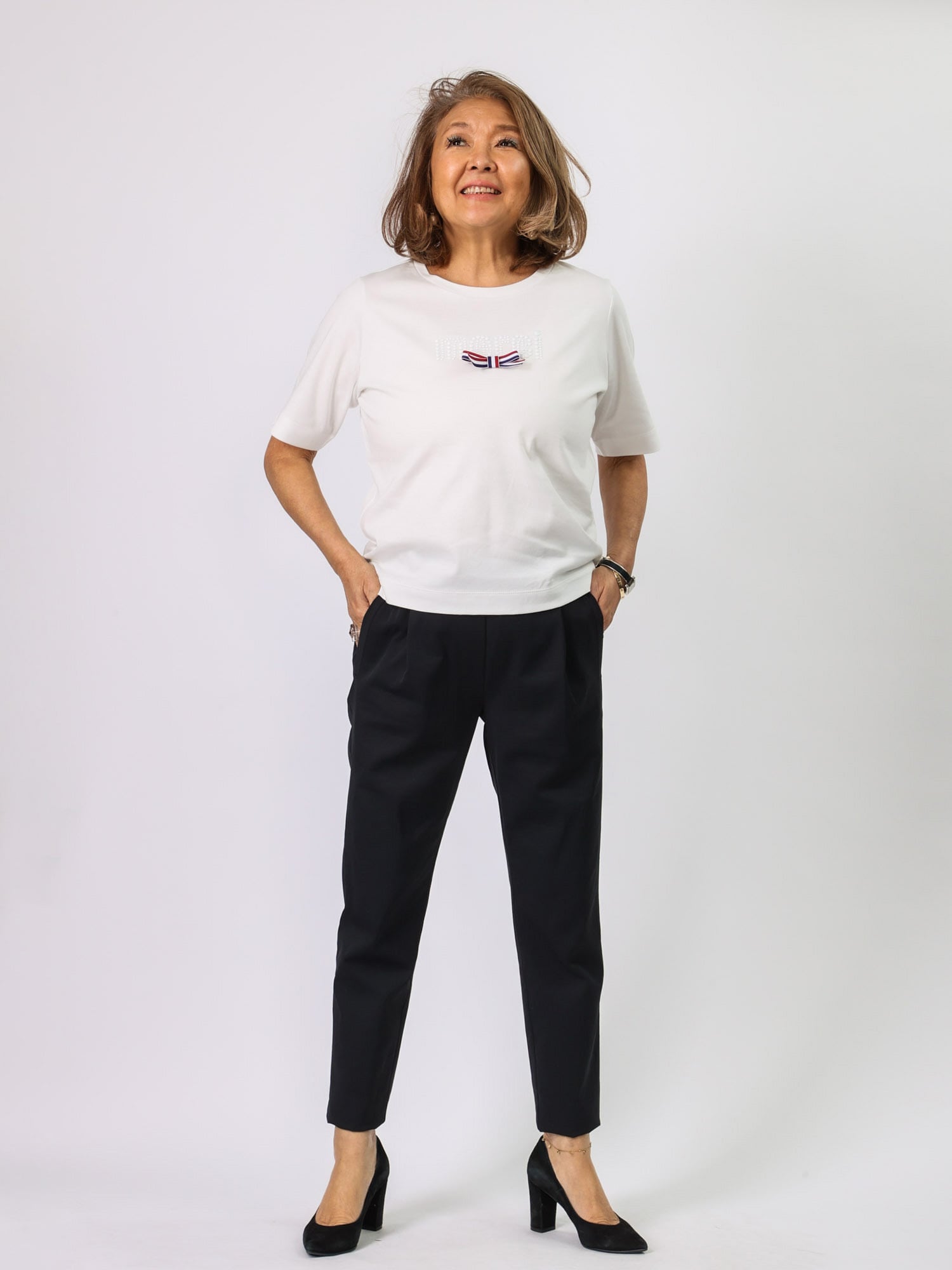 パール風ホットフィット+リボンがポイントのTシャツです。